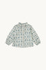 Blusa de niña con cuello fruncido hacia arriba y lazo en el centro. Las mangas anchas llevan goma en el puño.
