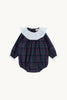 Pelele de bebé con cuello volante blanco. De manga larga acabada en goma canilla y con botones en la entrepierna para facilitar el cambio del pañal.