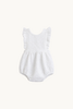 Pelele de bebé con volantes en los tirantes. Se cruza por la espalda y se abrocha con un botón de madera. Tiene la opción de doble ojal para alargar más el tirante. Se abrocha con tres botones en la entrepierna para facilitar el cambio del pañal.