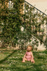 Peto de bebé de tirantes cruzados por la parte de detrás. Se ajusta con una goma en la cintura y muslos. Por la parte de detrás puedes ajustar el peto a la altura que mejor te convenga y fijarlo con un lazo pasando los tirantes por unas pequeñas trabillas.