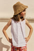Blusa de niña sin mangas con cuello redondo. Con detalle de pinza en el centro y puntilla en la sisa. Se abrocha por la parte de detrás con botones de madera.