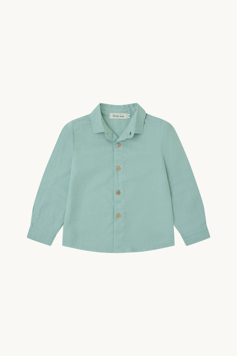 Camisa de cuello camisero con botones delanteros. Abierta por la parte de delante y con dos bolsillos delanteros. Por la parte trasera lleva una pinza para la movilidad del niño.