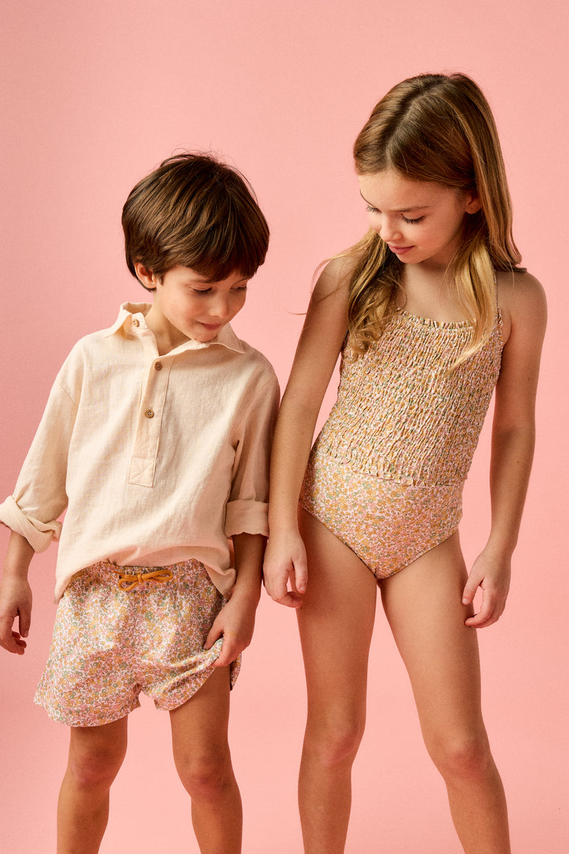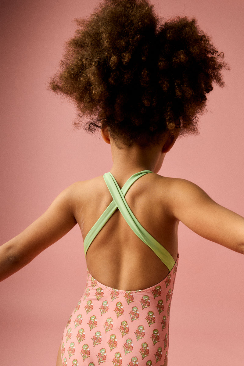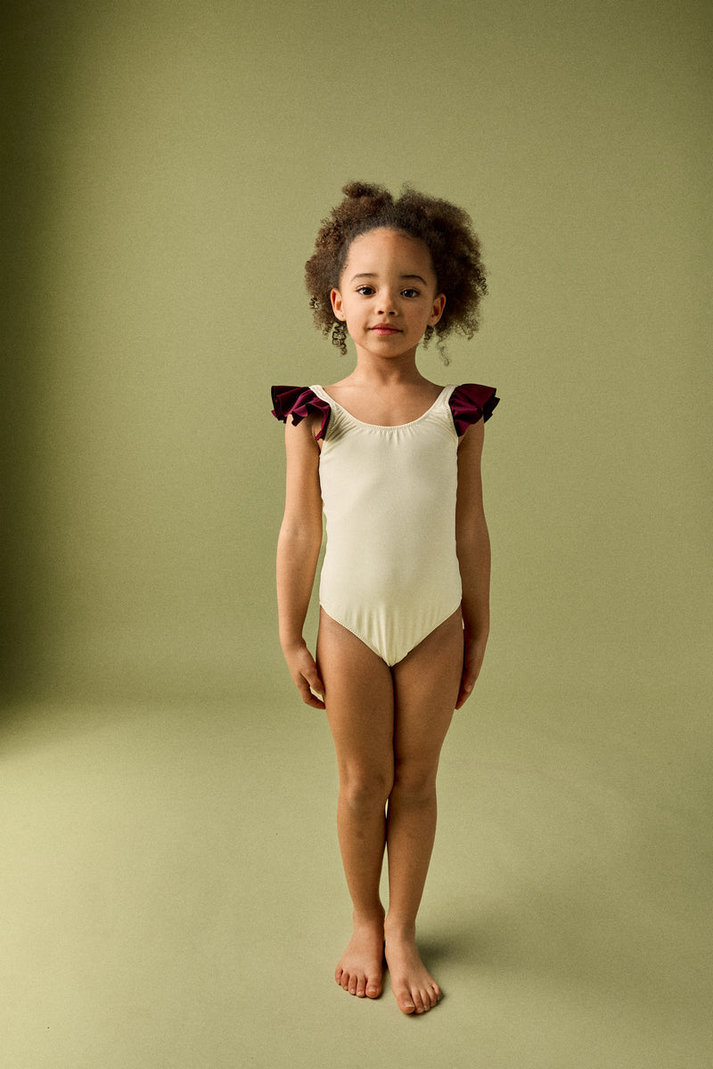 Bañador de niña de un tirante con volante. Lleva un tirante fino para mejor sujeción.