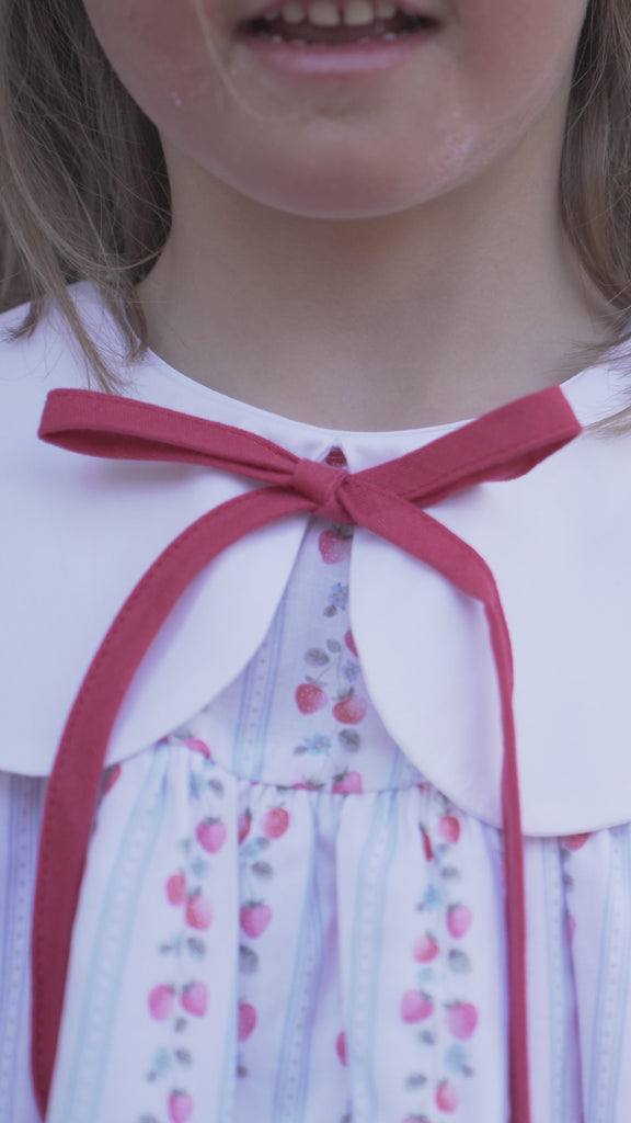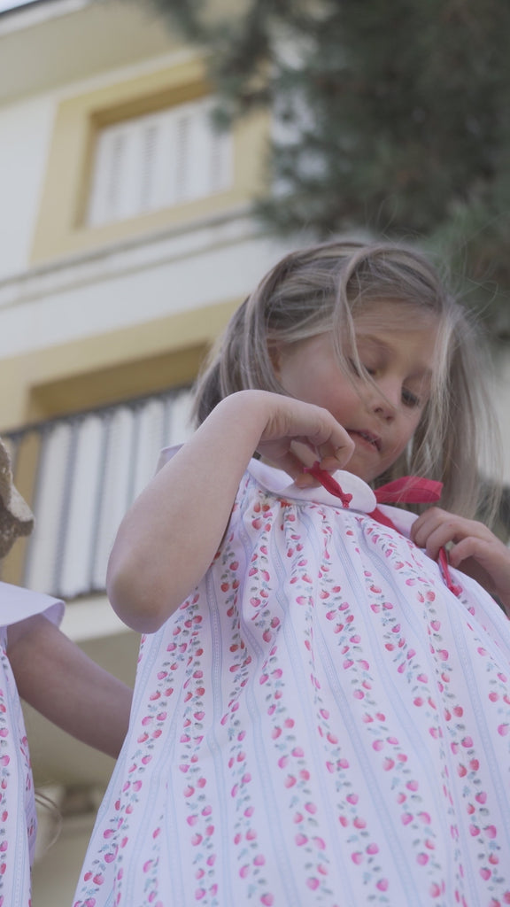 Vestido de niña sin mangas confeccionado con un delicado cuello redondo de popelín blanco que aporta un toque clásico y elegante. Su diseño destaca por la lazada central en contraste, un detalle que le da un toque sofisticado.