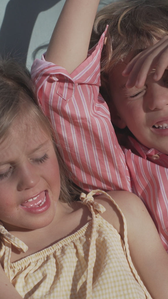 Camisa de cuello camisero con botones delanteros. Abierta por la parte de delante y con dos bolsillos delanteros. Por la parte trasera lleva una pinza para la movilidad del niño.